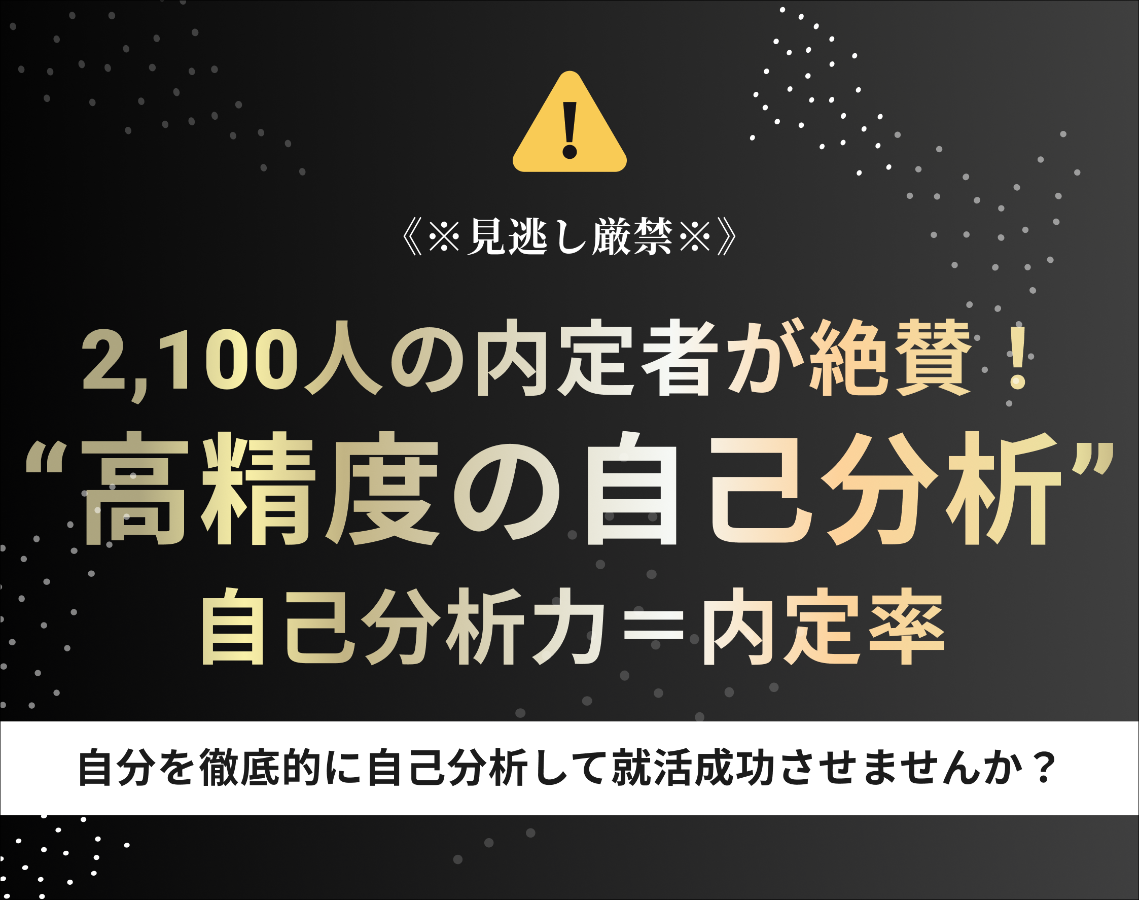 2,100人の内定者が絶賛した「究極の自己分析セミナー」なら、就活生データから成功・失敗の原因を分析し、社会から求められる人材・人事の目線から自己分析を通してあなたの強み、面接対策を発見することができます!実際に特別採用ルートで2,100名以上(2018~2020年卒)が内定を獲得しています。